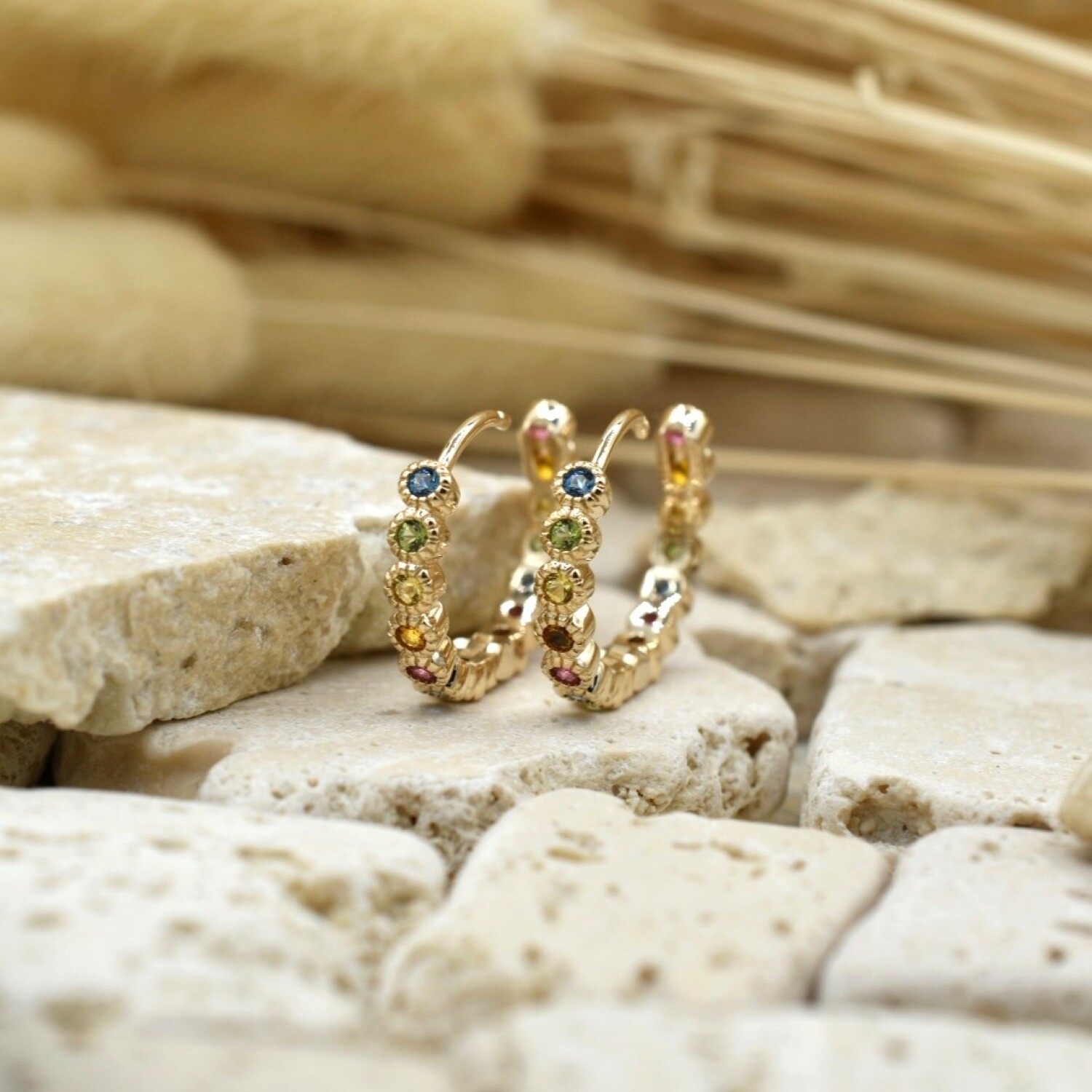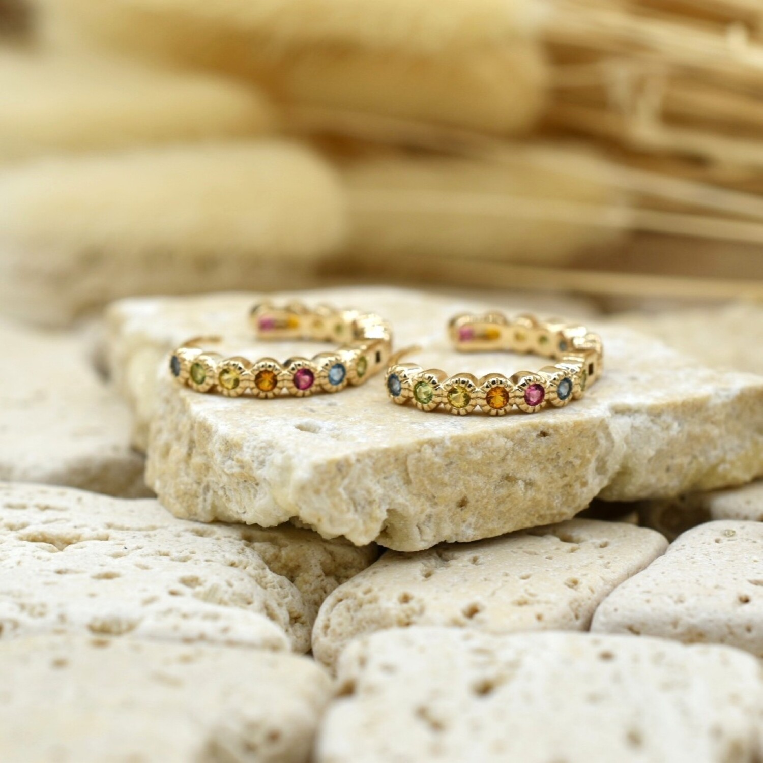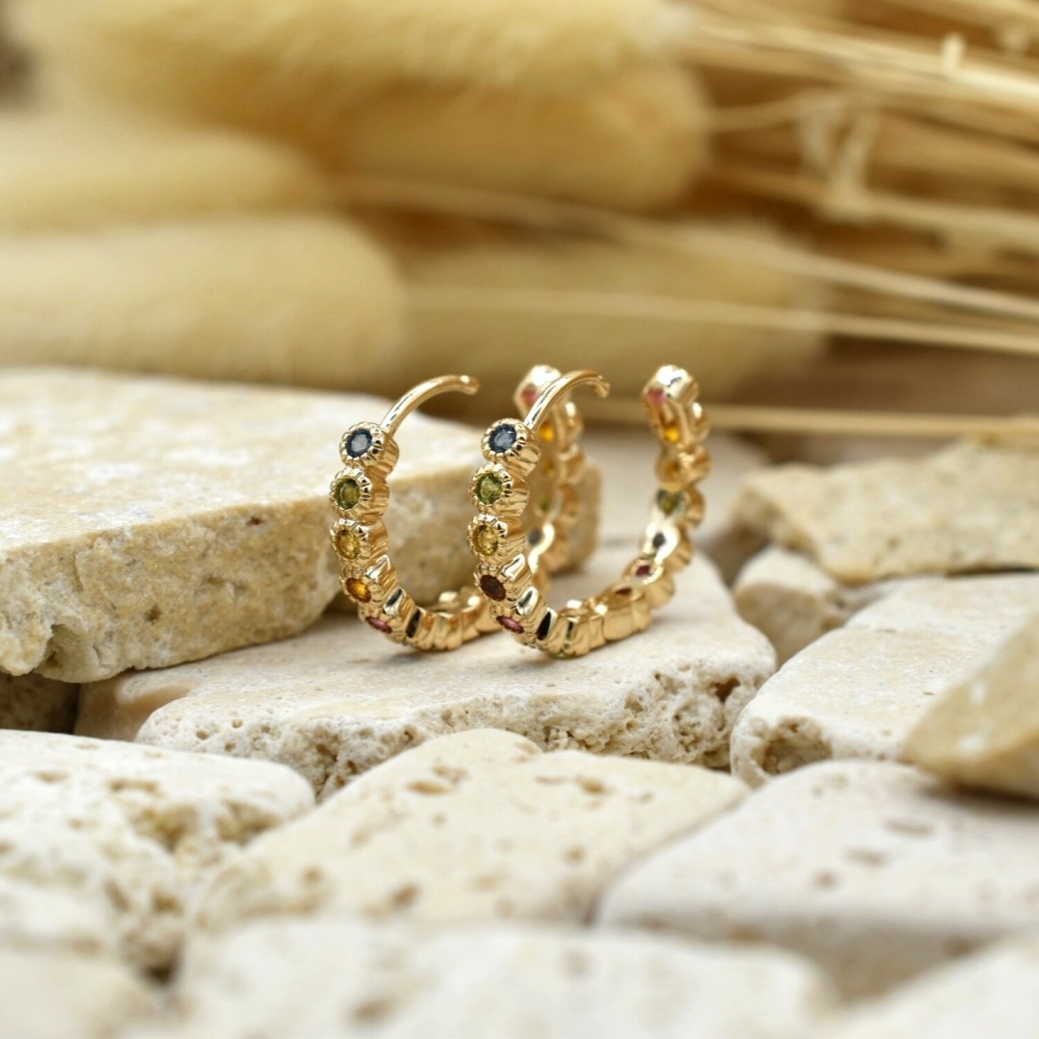 • Créoles en plaqué or 3 microns serties d'oxydes multicolores idéal pour habiller votre tenue de soirée.